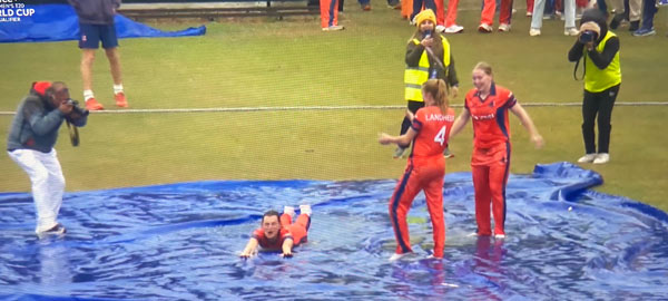 Strike bowler Isobel vd Woning missing today for family reasons, could be a big loss to the Netherlands hoping to go three from three today and secure their place in the World Cup Finals. But not so as her replacement Hannah Landheer takes three wickets, two for Caroline de Lange. Rapid start to the chase from Phoebe Molkenboer and Heather Siegers, boundaries flowing in the Powerplay. Fifty-seven on the board before Siegers departs with 3x6s in her 12 ball 28. Rain brings an end to proceedings with the Netherlands comfortably ahead on DLS. The rain can't stop the Dutch celebrations, pressure off them now, Ireland will be hoping that works in their favour on Friday.