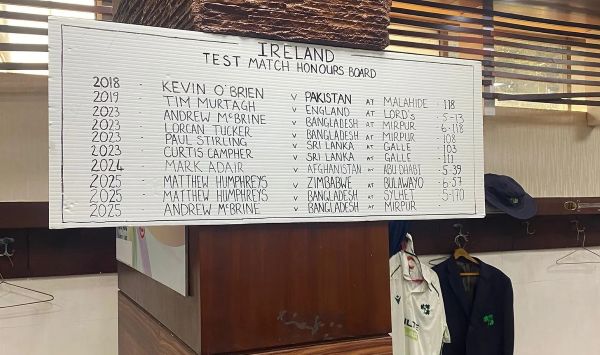 Ireland’s completed honours board in the changing room during the second Test in Mirpur. 📸: Chris Siddell