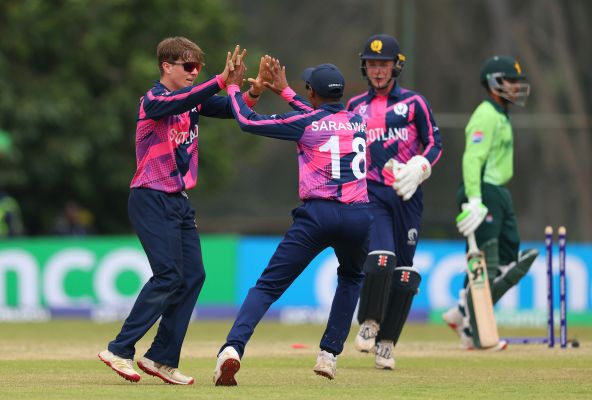 Pakistan opted to bowl upon winning the toss in Harare and Ali Raza instantly justified the decision, clean bowling Theo Robinson and Max Chaplin in the first over with full and straight deliveries. Captain Thomas Knight dug in for his 37 but when he was bowled by Momin Qamar (3/46), Scotland were 115 for six. Finlay Jones (33) and Manu Saraswat (25) compiled a valiant seventh-wicket stand of 58 but there was little resistance thereafter as Scotland were bowled out for 187 with 11 balls unused. In reply, Ollie Jones (2/41) removed both Pakistan openers in quick succession to leave the chasing side 48 for two. Usman Khan and Ahmed Hussain then combined for a match-defining stand of 111 to settle any nerves. Usman made 75 from 85 balls and Ahmed, who had earlier taken a brilliant diving catch in the deep to remove Saraswat, contributed a patient 47 from 92. Both fell before the job was done but captain Farhan Yousaf (18 not out) saw his side over the line with 6.5 overs to spare.