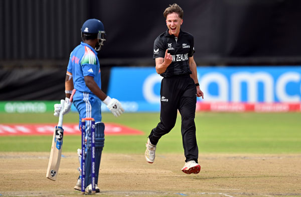 Tournament top scorer Ben Mayes leading the way again for England as the spinning pitch in Bulawayo put a brake on their normal free scoring style. New Zealand battling back after losing early wickets, Manny Lumsden with a pair. England glad to see the back of Snehith Reddy caught by Alphie Albert off Alex Green. Reddy was looking composed and looked like taking New Zealand into a good position. Manny Lumsden returns and mops up the tail, three wickets in an over that sees him complete a five-for. England unbeaten destined for the semi-finals, whether as group winners or runner-up is yet to be decided when India face Pakistan on Sunday.