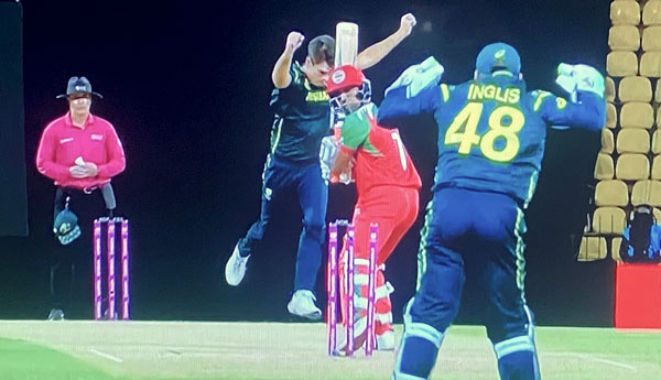 Instant success for Australia, a wicket with the first delivery but it should have been two, Glenn Maxwell spilling a straightforward catch at second slip in the same over. Nathan Ellis has the second in his first, a Karan Sonavale defensive prod finding its way onto the stumps. Full and straight from Bartlett accounts for Jatinder Singh who is bowled through the gate. A wicket in each of his first two overs for Adam Zampa leaves Oman 73-5 at the half-way stage. Wickets for Stoinis and Maxwell before the 14 overs drinks break, and another for the Big Show, Waseem Ali straight after as Oman pass 100. Two wickets with the first two balls of Zampa's final over wraps the innings up. Huge escape for Mitch Marsh in the first over as Oman don't review an lbw which they assumed was edged - in fact it was a classic 'pad-first' and smashing the leg-stump. He tees off and posts his half-century off the final ball of the Powerplay - 53* off 26. Travis Head is out with just a dozen runs required. Caught and Bowled Shakeel Ahmed hardly does it justice, a skier that he held at mid wicket jostling for it with keeper Jatinder Singh. Australia romp to the win inside ten overs, Marsh ends 64* off 33 (7x4, 4x6), Inglis sealing the win with a boundary.