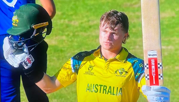 A Thomas Rew century in a 135 run partnership with Caleb Falconer the highlight of an England innings that at one time looked like topping 300. That it didn’t was down to a Australian fightback in the final ten overs that saw them claim three wickets including that of Rew. With the pitch a bit up and down and taking spin it will take an Australian innings to match Rew’s if they are to reach the Final and a lot rests Melbourne Renegades’ batter Ollie Peake to keep them in the game. Nitesh Samuel hits Albert for a big six but is stumped trying for another in the twenty-fifth over,111-3 at the halfway stage. Two wickets lost with little addition brings Aryan Sharma to the crease and he goes on the attack with fifty coming off the next six overs. He goes, caught in the deep and now it really is all on Ollie Peake. Hayden Schiller swinging away drills one to mid-off and 79 are required off the final 10 overs. A second wicket for Ralphie Albert with Peake turning down singles in the search for boundaries. WOW!!! 6,4,4,4,4,0 off Manny Lumsden takes him to 99. It's 32 off the final 4 overs for a place in the Final. Lachmund bowled by Morgan next ball - can Will Byrom get Peake back on strike? Yes he can and Peake hobbles the single that gives him his century. He has cramp in his leg and in his hands and can only squirt a cartch to point off James Minto. England win what was a great game, worthy of a Final.