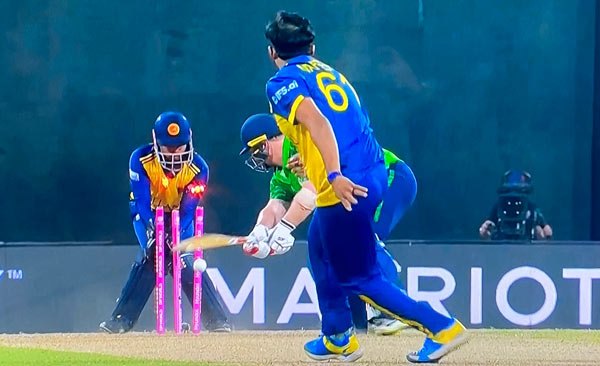 Bails light up as Paul Stirling is yorked by Theekshana