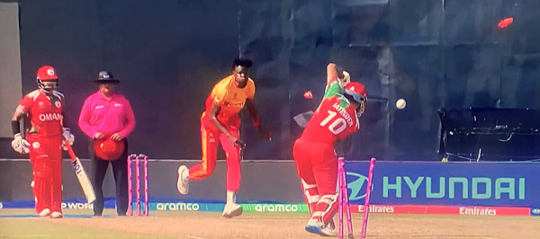 A wicket for Blessing Muzarabani with his first delivery and two more in his second over left Oman in the mire at 17-4 after 4 overs. Vinayak Shukla and Sufyan Mehmood tasked with the rescue mission add 42 before Richard Ngarava claims his second wicket and third in the same over. Two wickets from Brad Evans in the final over wraps up what was a clinical display in the field by Zimbabwe. Quick start to the chase with 30 on the board after three overs before Oman claim two wickets in the next three balls from Sufyan Mehmood. Brian Bennett and Brendan Taylor take Zimbabwe within one hit of victory before Taylor retires hurt leaving Sikander Raza to score the winning boundary.