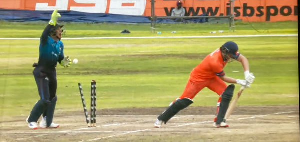 Netherlands openers Vikram Singh and Max O’Dowd battled through to the halfway stage of the reduced game posting 84 before both fell in quick succession. The innings turned into a procession after that with only Teja Nidamanuru offering any resistance but thirty-two precious runs added for the final wicket gave the Netherlands something to defend and defend it they did with some ease. Two wickets for Kyle Klein in his opening over, then three from off-spinner Ayran Dutt removed the middle order, before Zach Lion-Cachet wrapped things up with ten overs to spare.