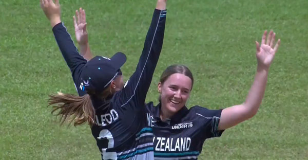 New Zealand's opening pair, Kate Irwin and Emma McLeod set off at a gallop, posting 49 before Trudy Johnson made the breakthrough. But they were to be the only double figure scorers as the Kiwis collapsed against Prisha Thanawala and POTM Tilly Corteen-Coleman. Four stumpings and a catch for England keeper Katie Jones, as slow left-armer Corteen-Coleman wrapped up the innings with three wickets in the final over. England's chase began with Davina Perrin and Jemima Spence rattling along at 10 an over, and even after their departure two wickets from leg-spinner Rishika Jaswal could not halt England's race to claim a place in Friday's semi-finals.