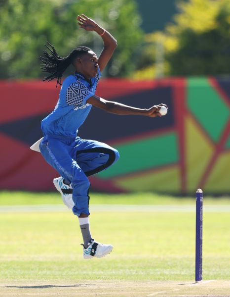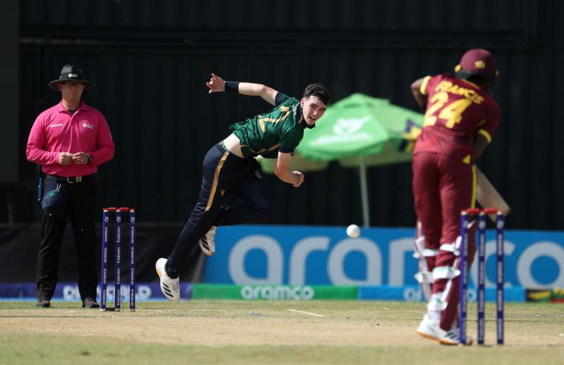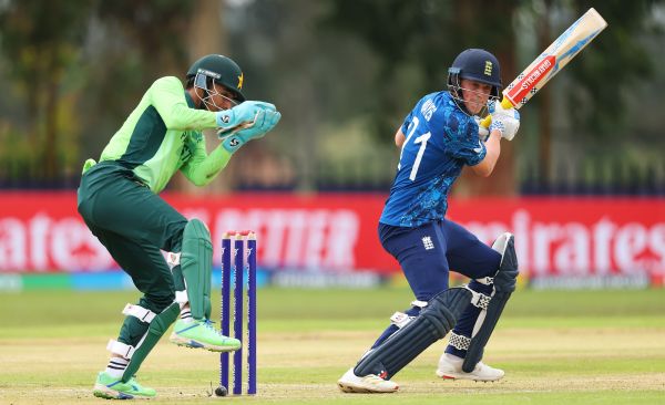 Tournament top scorer Ben Mayes leading the way again for England as the spinning pitch in Bulawayo put a brake on their normal free scoring style. New Zealand battling back after losing early wickets, Manny Lumsden with a pair. England glad to see the back of Snehith Reddy caught by Alphie Albert off Alex Green. Reddy was looking composed and looked like taking New Zealand into a good position. Manny Lumsden returns and mops up the tail, three wickets in an over that sees him complete a five-for. England unbeaten destined for the semi-finals, whether as group winners or runner-up is yet to be decided when India face Pakistan on Sunday.